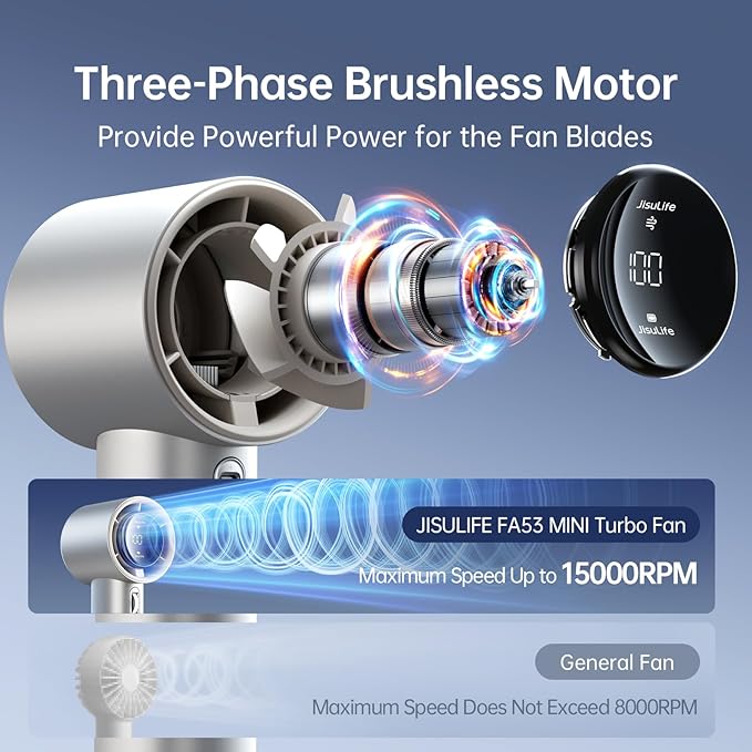 - Brushless Motor - Super Power: The combination of a three-phase brushless motor and a 5000mAh battery significantly improves the wind speed, power, and endurance. The maximum wind speed can reach 9m/s. The highest rotation speed of the handheld fan is three times that of a regular personal fan, reaching up to 15000 RPM. It can cool for 3-15 hours on a single charge