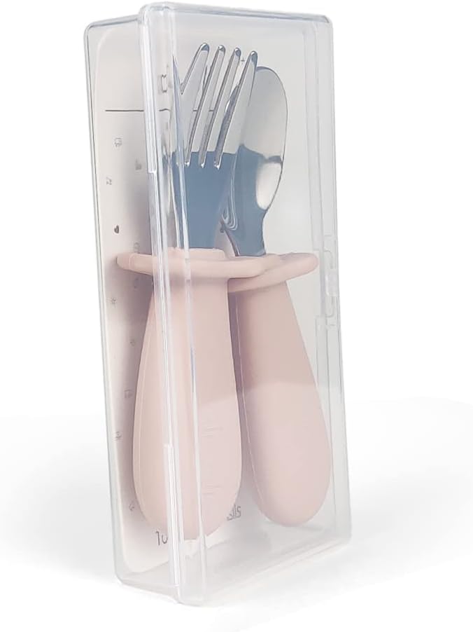 Ali+Oli Spoon & Fork Learning Set for Toddlers (Powder Pink) 6m+ Grab Easy BPA Free Food-Grade Silicone Handle, Kids Silverware Self Feeding Baby Utensil, Multi-stage Baby Feeding Set Ergonomic Design