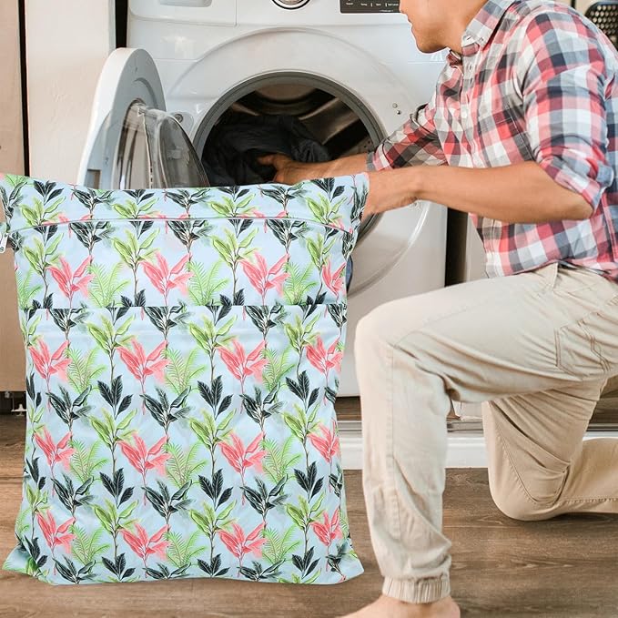 - 2 ZIPPERED POCKETS & HANDLE DESIGN: The 2 pack laundry bags are designed with 2 zippered compartments to keep wet and dry clothes separately, or separate dirty and clean diapers. Keep dry and clean. There's a handle with a button on one side for hanging up, convenient to carry and attach to your stroller, doorknob, towel rack, hook or handbag.