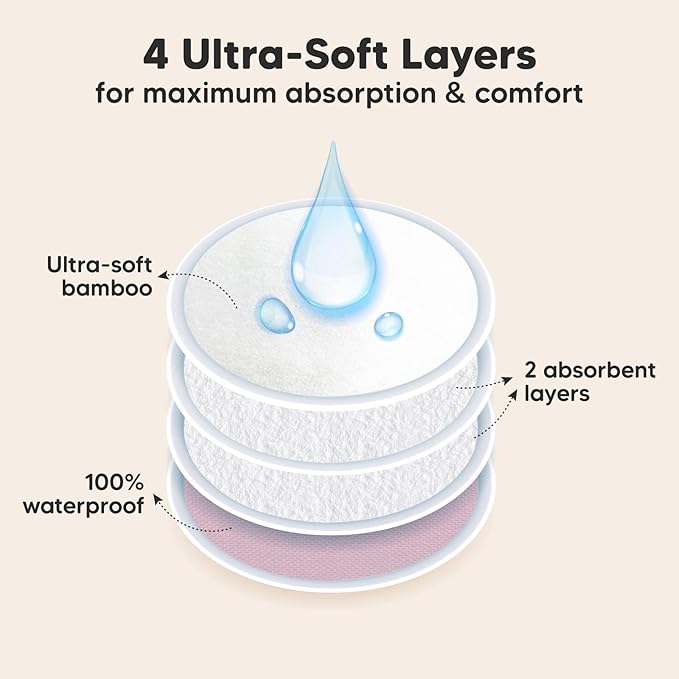 - Great For Leakages – Leakage is a thing of the past with our 4-layer nursing pads. KeaBabies Nursing Pads feature three layers of ultra-absorbent viscose derived from bamboo, sealed with a protective waterproof outer layer for extra security on the nipple pads. Tip: If you experience a heavy flow, please replace breast pads every 5-6 hours.