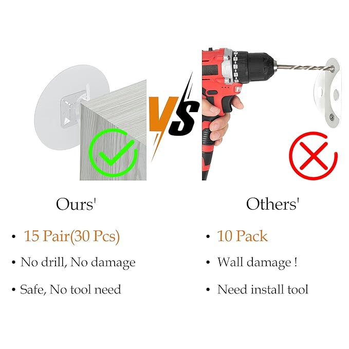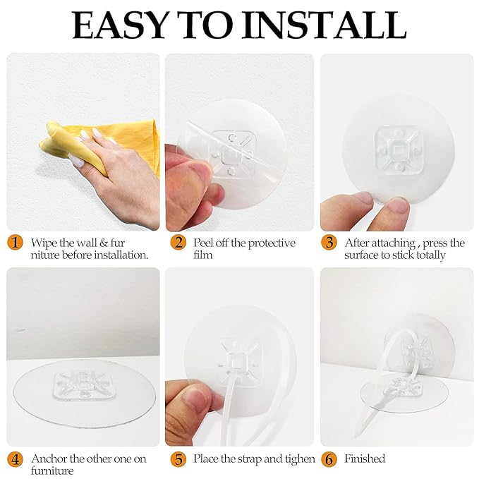 - 🔧【No Drill Wall Anchor for Furniture】: This furniture anchors does not require any drilling, hence making it a better choice for home safety.Easy to install and remove,please wipe the surface both of the wall and furniture before use, peel off the protective film, firmly stick it on the flat and non-porous surface to ensure stick tight, then tighten with the anti tip nylon straps. These wall anchors will not leave sticky adhesive after remove it.