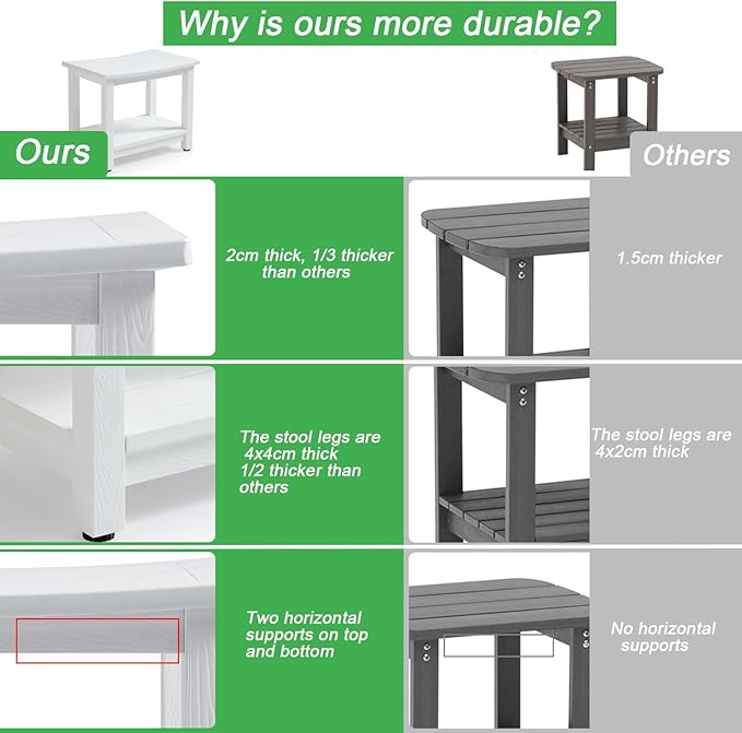 - 【Easy to Assemble】The plastic shower bench seat comes with all hardware you need to assemble, and the most important is the screws of the bench is invisible, not like other's bench all screws are visible