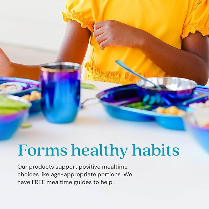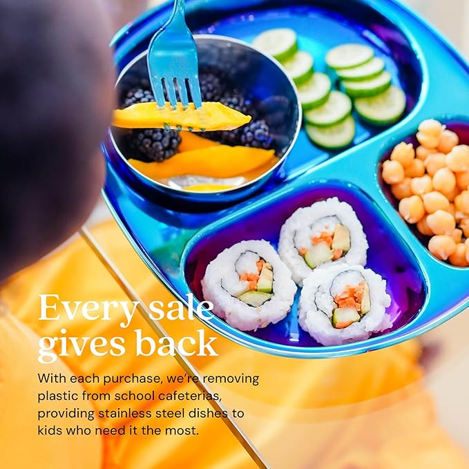 - Kid Approved โ Ahimsa Mindful Mealtime Sets make mealtime fun with vibrant and colorful stainless steel kids plates that children adore. Included is a stainless steel toddler plate with dividers, a 8 oz. kids stainless steel cup and small baby bowl, and kids silverware (1 kid fork, 1 kid spoon).