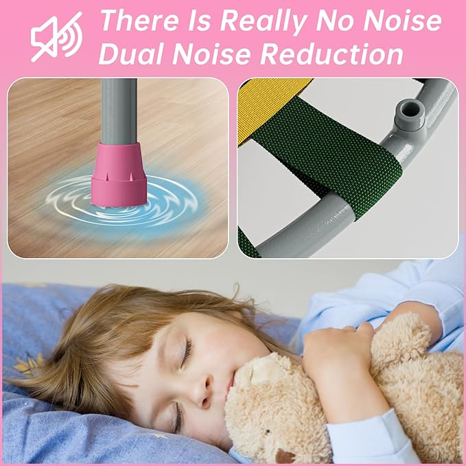 - 【SAFE AND FUN】 The padded handlebar is adjustable from 32.6” to 40.5” which fits your kid’s height perfectly. Kids can use the handlebar for easy grip to control their bounce. This springless trampoline is safer than the spring rebounders, primarily due to more soft parts. There is less of a chance of experiencing pinched fingers or toes, regardless of the safety precautions in place. Moreover, this trampoline has been added with a covering on top of the bands to provide safer jump pad surface
