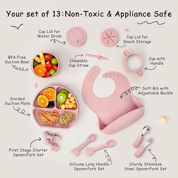 - 🥣【13 pcs Set Contains Everything Your Baby Needs】This Silicone baby feeding set contains a 4-compartment suction plate, suction bowl, straw sippy cup with 2 lids, adjustable weaning bib, and 3 sets of fork and spoon for different stages. This silicone baby feeding set has everything your baby needs to eat independently.
