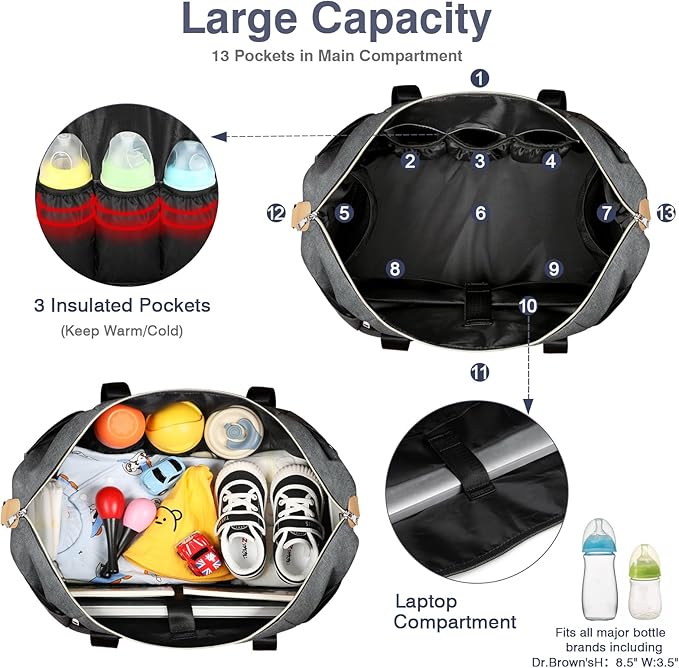 • Large Capacity & Multi-Pocket: Multifunctional pockets for newborn baby essentials including a main compartment, a front pocket, a back zipper pocket, 3 insulated pockets and 8 easy-access pockets inside for bottles, diapers, or wipes. Two sides pocket, wipes can be easily extracted from a hole in the outer layer. When you need to put something else, you can use velcro to prevent things from falling. Say goodbye to searching crazily in the bottom of your diaper bag for that one lost item.