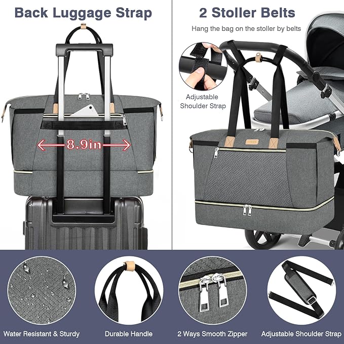 • Convenient Carry on Diaper Bag: Our large diaper bag equipped with an adjustable shoulder strap and thickened support, easily converts from a shoulder bag to a cross-body bag. This diaper bag tote is equipped with 2 baby stroller straps, you can hang the mommy bag on the stroller and free your hands. And a handy luggage sleeve at the back could slide over the carry-on luggage handle easily.The tote bag is a great choice for parents who need a diaper bag for traveling with their baby.