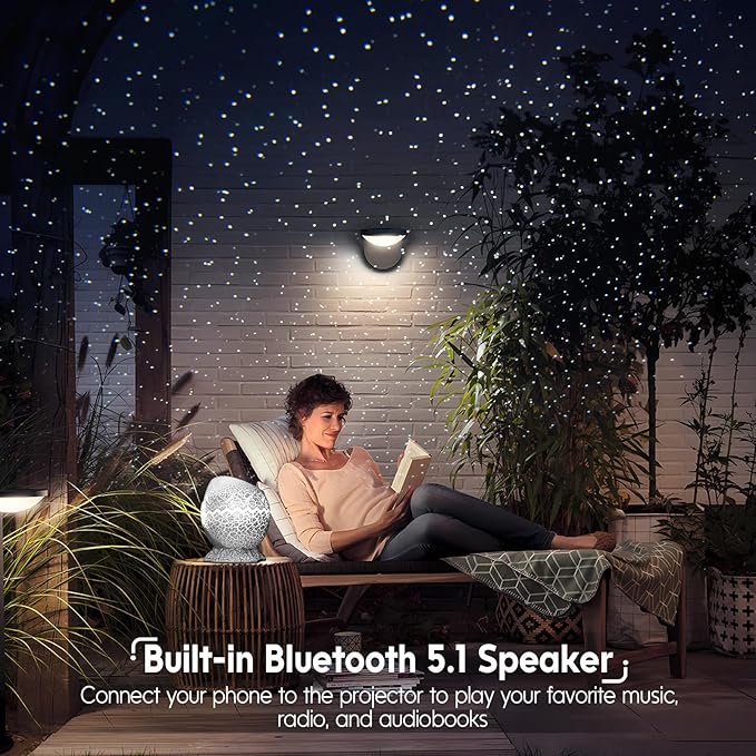 - Bluetooth 5.1 Speaker & Sound Activated - The galaxy projector features a built-in Bluetooth speaker. Connect your device via Bluetooth to play some music through the galaxy light projector and watch in amazement as the little stars blink and northern lights moves rhythmically to the beat of the music. You can activate the sound function from the remote control and the night lights will flash and change according to the music rhythm or by clapping your hands, resulting in immersive experience.