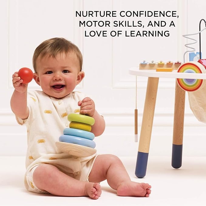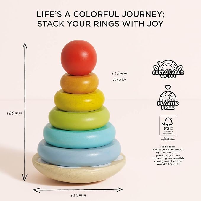 - SAFE, HIGH QUALITY, FROM SUSTAINABLE FORESTS - Decorated with water-based, chip-resistant non-toxic paints and tested to the highest safety standards. Includes 5 stacking rings, 1 wobbly base and a cap