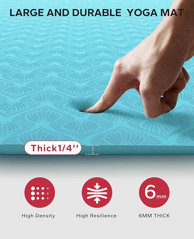 - 𝐄𝐱𝐜𝐞𝐥𝐥𝐞𝐧𝐭 𝐂𝐮𝐬𝐡𝐢𝐨𝐧𝐢𝐧𝐠&𝐑𝐞𝐬𝐢𝐥𝐢𝐞𝐧𝐜𝐞: The exercise mat is 6mm thick, providing excellent comfort and support in various yoga poses. Whether you're a beginner or an experienced yoga enthusiast, this yoga mat can meet your needs. Its outstanding cushioning and resilience will help protect your joints and reduce the stress on your body. We believe this yoga mat will be the perfect companion for your practice