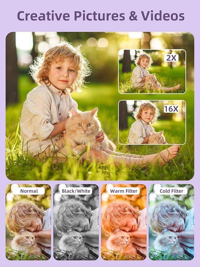 - ENCOURAGE CREATIVE - If you are tired of its automatic results, the point and shoot camera allows you to customize pictures. 16X zoom is great for photographing objects in the distance. 20 pcs creative filter effects to take Vintage photos, Black/White photos..., Anti shake, webcam, face and smile detection, continuous shooting, self-timer, waiting for you to explore them.