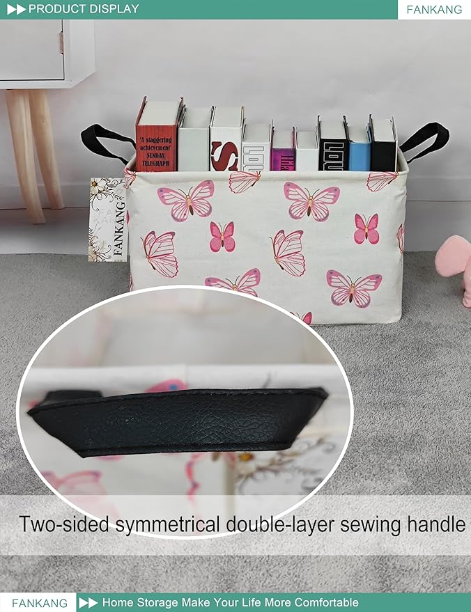FANKANG Storage Bins, Nursery Hamper Canvas Laundry Basket Foldable with Waterproof PE Coating Large Storage Baskets for Kids Boys and Girls, Office, Bedroom, Clothes,Toys(Rec-pink butterfly