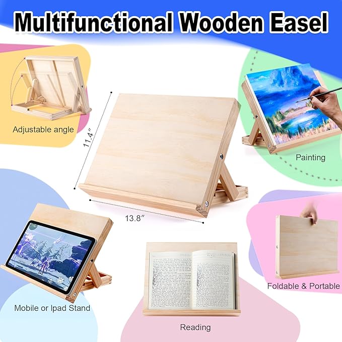 - 【Multi Wooden Easel】:There is a multifunctional Wooden table easel in the kit, which can support painting on the desktop, it can be folded and can be used as a stand for painting, Ipad and Crafts.