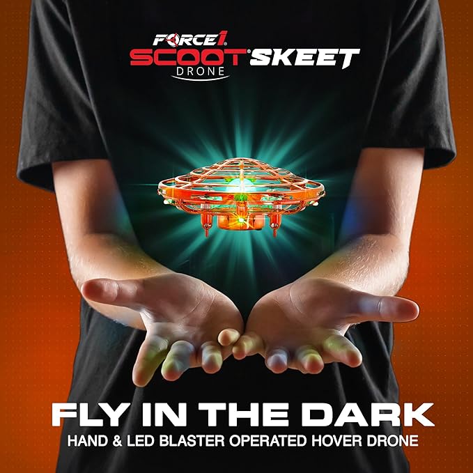 - New Drone Technology: Featuring the same patented motion sensor technology as the Original Scoot hand controlled drone for kids, the NEW Scoot Skeet series drone has special integrated motion LED sensors making it compatible with the Scoot Skeet LED light blaster (not included).