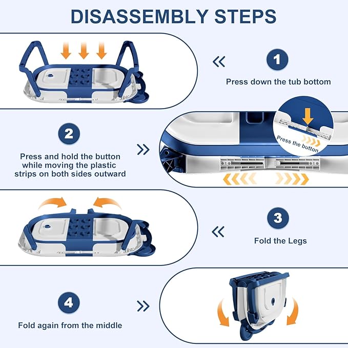 - Double-Fold Collapsible Design: TPN collapsible baby bathtub features an ingenious double-fold design, compactly measuring less than 4 inches in thickness. This facilitates effortless storage in any corner and enhances portability for on-the-go convenience, making it a perfect companion both at home and during travel. The off-the-floor drain with a user-friendly rubber plug guarantees seamless draining without the need for relocation.