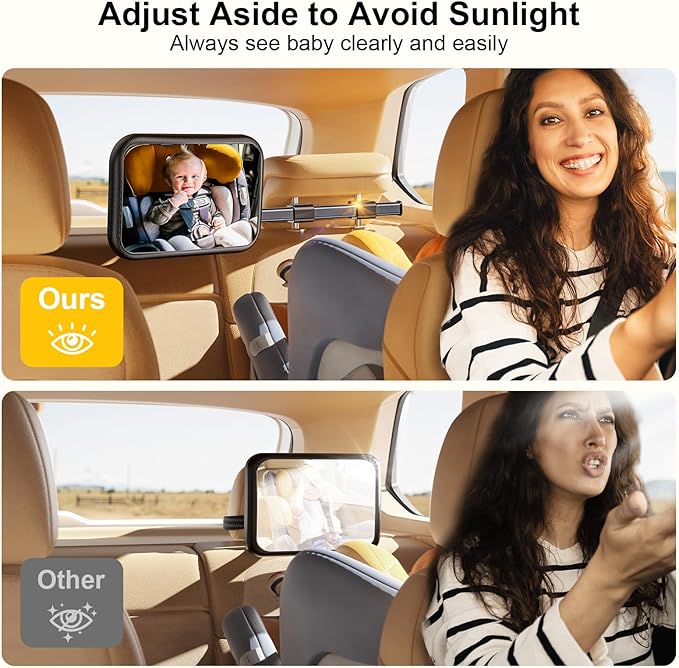- [Safe Shatterproof Mirror] The baby car mirror has shock-absorbing frame with anti-cracking coating, passed the 100,000 Crash test and has high quality certification. Even in the most critical situations, the car mirror for baby will never break, and there is no need to worry about hurting the baby in daily use.