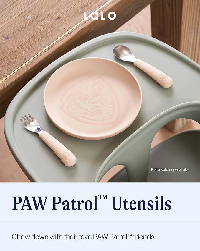 Lalo PAW Patrol Utensils - Toddler Fork and Spoon Set - Stainless Steel and Silicone Ergonomic Toddler Utensils - Children Safe Flatware Set - 2 Pieces - Skye