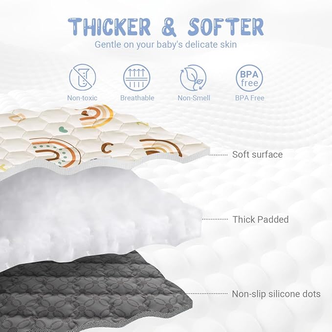 - 【Space to Play】This 71x59 baby play mat gives your little one plenty of space to crawl, roll, and play. Whether engaging in solo play or sharing the mat with siblings, they'll always have enough room. baby playmats are made of soft microfiber with a thickened finish for extra cushioning and comfort, provides safe place for your child to romp around.
