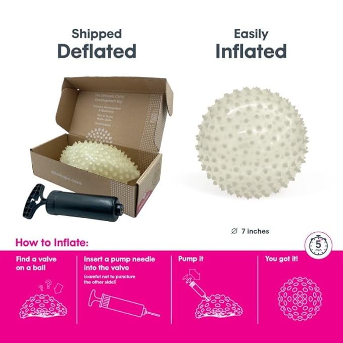 - WHAT'S INSIDE: A set includes one 7" Glow in the Dark Deflated with Pump sensory ball for toddlers 1-3. Our baby development balls come deflated but can be easily inflated via a built-in valve. Recommended for kids aged 6 months and up!