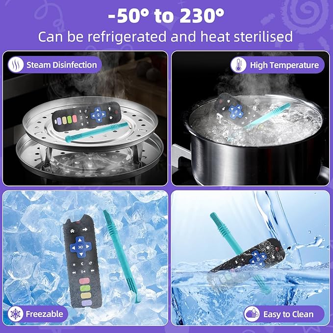 - 👶【TEETHING TOYS for BABIES 0-6 6-12 MONTHS 】You will get a black baby remote control toy , 3 different color hollow teething tubes, 1 tube brush and 1 keeper strap. Baby remote teether features bright color and realistic button design that looks like real TV remotes which improve color recognition & hand-eye coordination, learn early education. baby teething straws have 2 unique textured design for soothing sore gums, and gums with soft silicone bristles, which helps develop good oral hygiene.