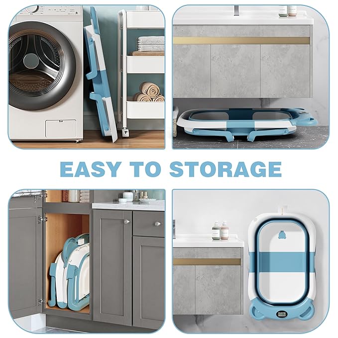 - 【Double-Fold Collapsible Design】Our upgraded baby bath tub can be effortlessly folded in just two steps to a thickness of under 4 inches. It even folds in half, enabling convenient storage in any corner, making it a space-saving solution.