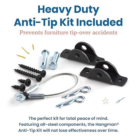 - Anti-Tip: Contains a heavy-duty HANGMAN Furniture Anti-Tip Kit featuring all-steel components; when properly installed using the attached instructions, prevents furniture tip-overs