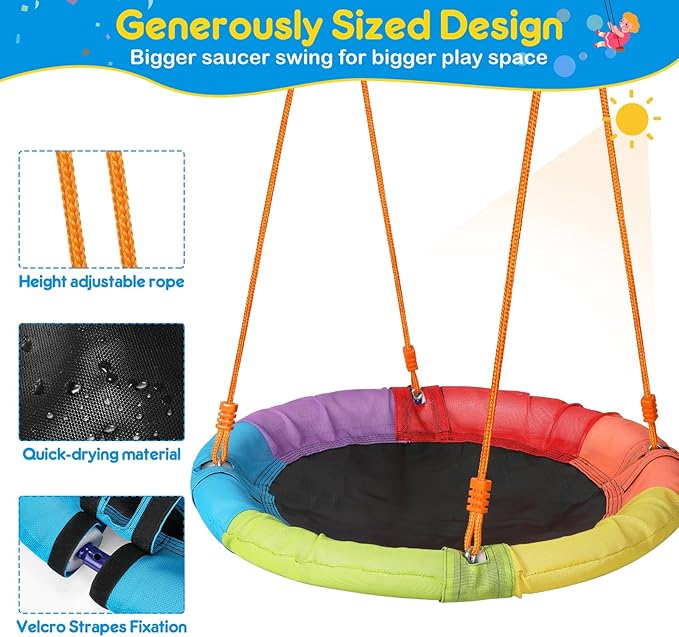 - Solid Frame and Sturdy Fabric:Our swing set features a strong metal A-frame, ensuring stability and safety with a 440 lbs weight capacity. The saucer swing boasts a resilient Teslin fabric seat, while the swing seat is made of non-slip polymer plastic