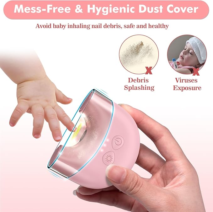 - 👶【Designed with Care for Babies】Megainvo baby nail trimmer electric is designed by experienced moms with the utmost care for your little ones. Oriented for safery, this baby nail file features specialy designed grinding heads to effectively trim fragile baby nails without causing any harm or discomfort. They auto stop with hard pressing to provide extra safety. The nail trimmer for baby also has a thoughtful nail dust cover to absorb dust and ensure a hygienic and mess-free experience for you.