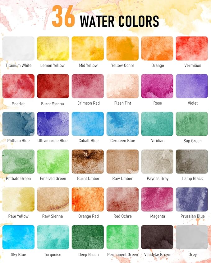 - 78PCS Complete Kit:Come with 36 Tubes premium quality watercolor paints, 8 synthetic painting brushes, plastic mixing palette and 25-sheet watercolor papers, art sponges, pencil, eraser, sharpener, masking tape, color Wheel, you can start creating colorful masterpieces right away. User Instruction for beginner included.