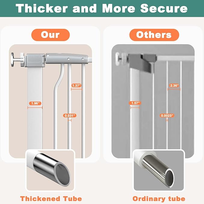 - 【1.37" Ultra Narrow Spacing】Metal tall dog gate indoor ultra-narrow gaps between each two bars are only 1.37", which effectively prevents pets and kids bodies or heads from getting stuck. What's more, extra tall pet gate has an upgraded thicker pipe wall, making it more solid and stable.