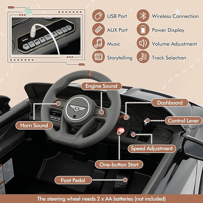 - 【Officially Licensed Bentley Bacalar】This licensed Bentley ride-on car features a super cool appearance that appeals to kids a lot. Double doors with locks and gas rods as well as realistic rear mirrors mimic the outlook of a real Bentley. Moreover, 2 × 12V powerful motors and a 12V rechargeable battery ensure profound performance.