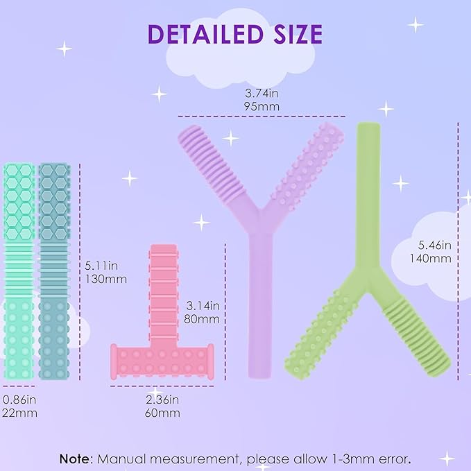 - FUN TEETHING TOYS: Our sensory teething toys set includes 1 pcs T shaped, 2 pcs Y shaped sensory chewy toys and 2 pcs teething tubes, helps keep your kids from chewing on fingers, pencils, hands, clothes, hairs, etc. Reducing stress, anxiety especially when they need to soothe, calm, or focus
