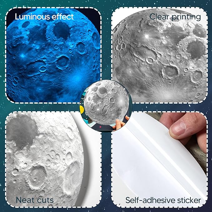 - Robmoda Glow in The Dark Planet - One piece of moon sticker made up of non-toxic, eco-friendly, waterproof, pressure resistant, shock resistant& durable fluorescent PVC. It comes in 23.5 cm (9.25โ).