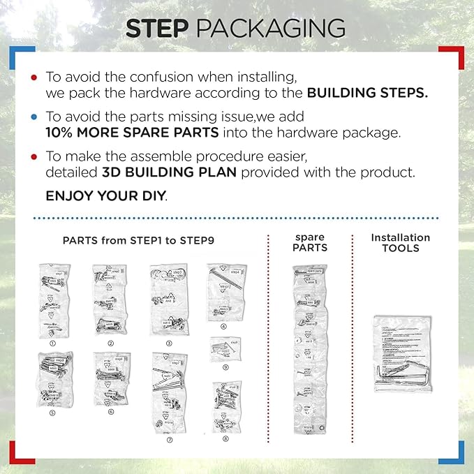 - ORDERLY PACKAGING: In order to avoid the confusing when installation, we pack the hardware according to the building steps; add 10% more spare parts into the hardware package; detailed 3D building plan makes the assemble procedure easier