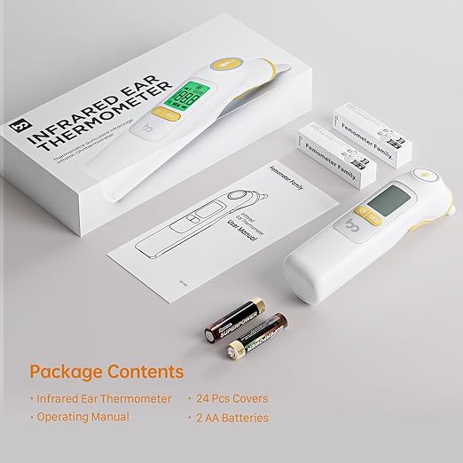 - WHAT YOU GET: Package includes an ear Thermometer, 24 disposable ear muffs, 2 x AA batteries, user manual and a quick guide in your local language, you will also get a 1 year replacement/repair service, during this period, any problem with the product, our customer service team will do their best to help you!