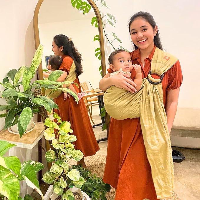 Mamaway Baby Ring Sling Carrier - Newborn and Toddler Sling (Supports up to 165lbs), IHDI Certified, Rayon & Linen Made, Soft & Breathable, Nylon 66 Safety Rings, Storage Pocket Design, Khaki