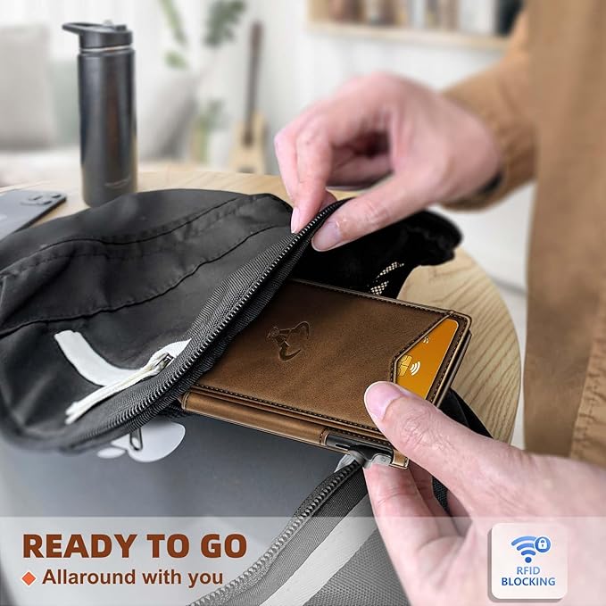 - CAPACITY-Pop-up metal Case in flipping leather shell,9 card slots (including 1 ID window) and metal money clip for couple of bills;