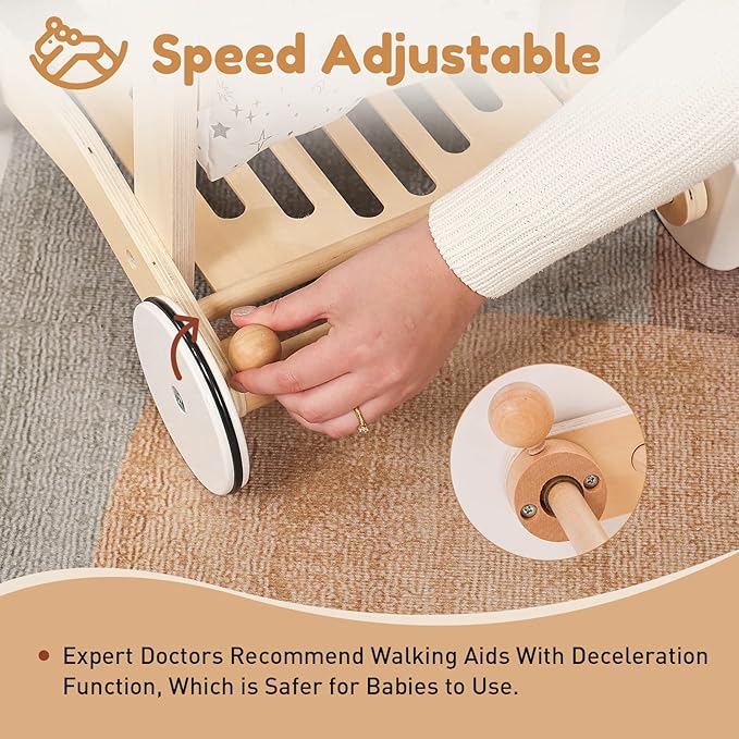 - SPEED ADJUSTMENT - Our unique wooden baby walker design with speed adjustment, parents only need a simple rotary adjuster to control the speed so as not to hurt the baby for too fast speed. Appropriate speed of the baby push walker can also allow toddlers to learn to walk correctly. Expert doctors recommend walking aids with deceleration function, which makes baby learning to walk easier and safer