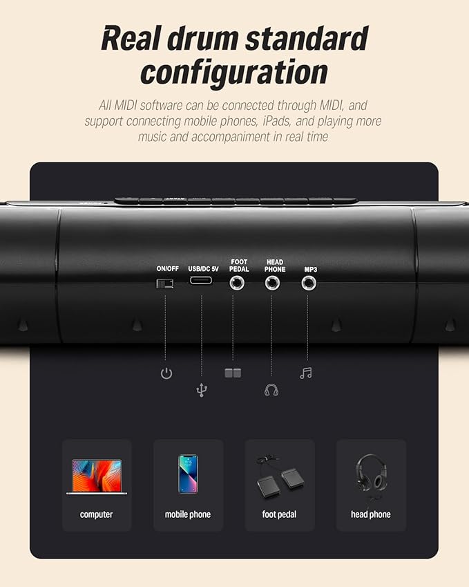 - [MIDI Connect & Gameplay] Come with standard midi out jack and USB midi out jack, you can connect the drum to computers to produce music or play games, or connect external speakers for family entertainment/birthday parties. Perfect for adults who need MIDI functionality and children for entertainment.