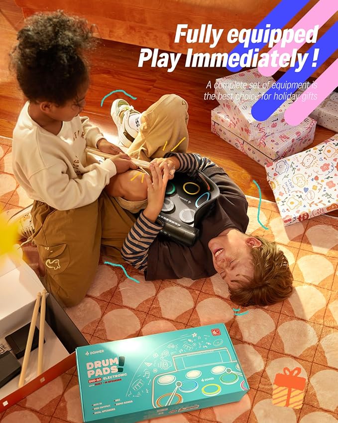 - [Ideal Music Enlightenment Toy For Kids] You can send the DED-20(SE) electric drum set for your kids, families, and friends as present for Birthdays or Christmas. It contents:1 x electronic drum pad(mobile power charging support), 1 x power adapter, 1 x USB data cable, 1 x 3.5mm audio cable, 1 x drum sticks, 2 x drum pedals. Any questions contact us.