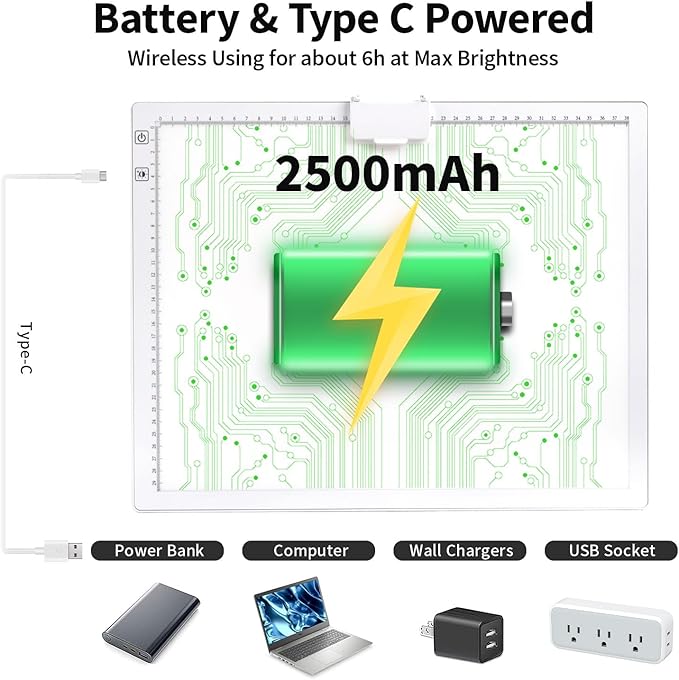 - [USB-C Powered and Battery Powered] The A3 rechargeable LED light pad contains a 2500mAh lithium battery, which can work for about 5 hours after 2 hours of charging, allowing you to enjoy the convenience of using it anytime, anywhere. We use an upgraded Type-C port that is more sturdy and stable to maintain stable charging. Comes with a 6-foot (1.8 m) cable that conveniently plugs into your laptop, power bank, USB adapter, and more. Applicable to both battery mode and charging mode.