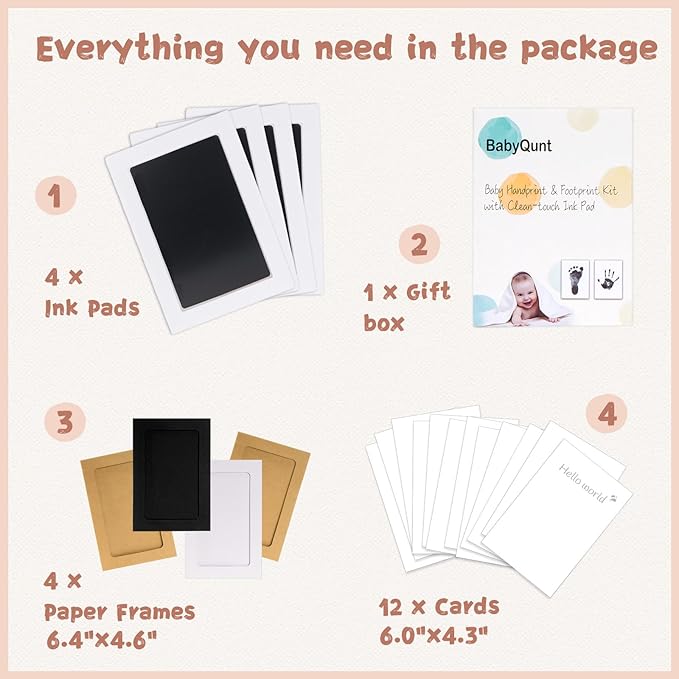 - 【Product Details】: Our baby hand and footprint kit measures 6.0"x4.2" with an ink window of 4.9"x3.1", which is the best size for recording hand and footprints of newborns 0-6 months old or pet paw prints . The ink pad for baby hand and footprints includes 4 clean touch ink pads, 12 stamping cards, and 3 display frames, ensuring you have ample opportunity to capture the best stamp.