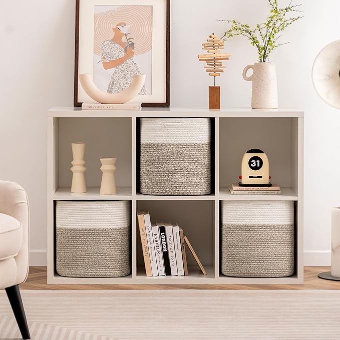 joybest Cube Storage Bins Set of 4, 13inch Cube Baskets Organizer for Nursery, Square Cotton Rope Baskets for Shelves Organizing, Kids Toy, Closet Storage, Brown and Cream White