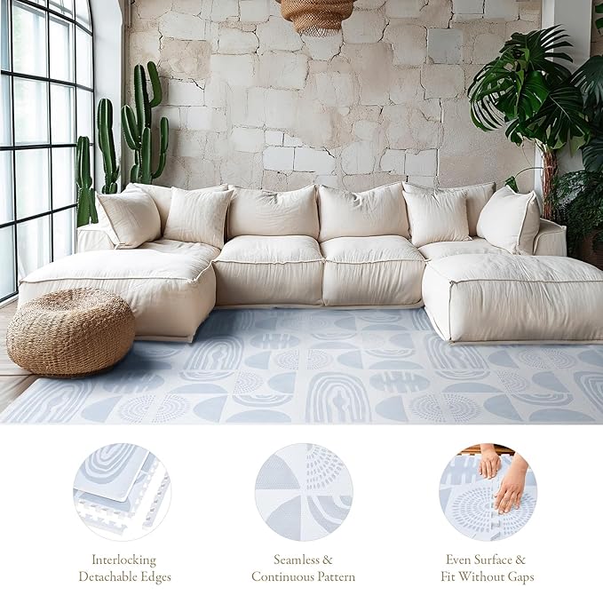 - 【LARGE AND THICKER FOAM PLAY MAT】The PopsyKosy playmat is a large and thick foam mat that comes with 6 interlocking tiles, each measuring 24"x24". The 0.5" thick padding provides a cushioned and safe play area for babies and toddlers, ensuring their comfort and safety during playtime. To maximize both the aesthetics and functionality of your play mat, choose a size configuration that covers the entire room/space.