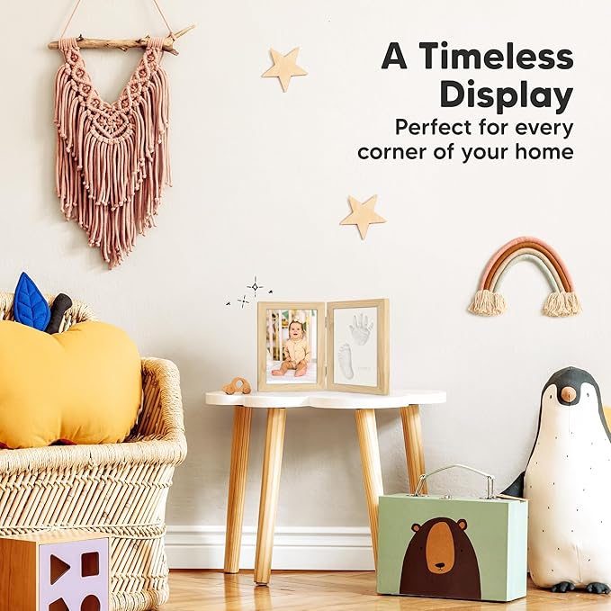 - All-in-one Baby Handprint and Footprint Kit - An elegant bi-fold Rune wooden frame with real glass cover, baby-safe air-dry clay, a wooden roller, alphabet stamps, paint and brush for personalization, and double-sided tape to keep it all in place.