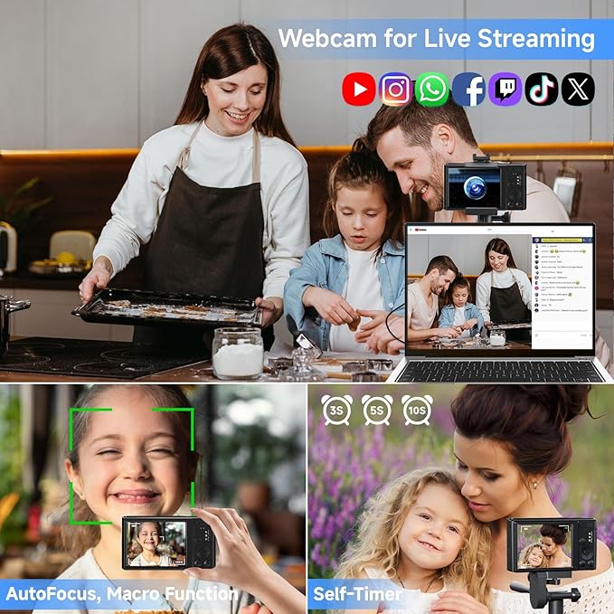 - Vlog Webcam and Upgraded Fill Light:The digital camera with video can be used as a live webcam, the pause function allows you to pause while recording. Built in 3 flash bulbs make the illumination brighter, helping you take clear photos even in low light