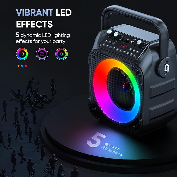 - TWS Mode and Brilliant Light Show: Bluetooth karaoke machine supports TWS function, which can realize the interconnection of two machines to form a dual-speaker karaoke system(The TWS function is only available for speakers, and microphone sound can only be emitted from the paired speakers). Dual-channel surround for stunning stereo sound. Our karaoke machine's 5 dynamic color modes. Whether you're hosting a lively indoor party or enjoying a backyard barbecue, effortlessly switch between mesmerizing 5 light effects that create an enchanting atmosphere. Enhance every note and beat, transforming every gathering into a memorable event