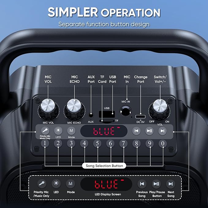 - Multi-function Karaoke Machine: This portable karaoke machine features 15W 6.8-inch premium speakers, upgraded Bluetooth 5.2 connectivity, 2 interference-resistant wireless microphones, separate function buttons and vibrant dynamic colored lights, and supports Micro TF card, USB flash drive, and AUX connectivity. This karaoke machine for adults has powerful sound, clear vocals, easy operation, and creates a happy atmosphere, with it you have a speaker, microphone, radio, media player and guitar amplifier, versatile, the best companion for fun