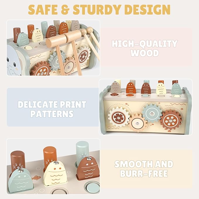 - Multifunctional Toy Set for Endless Fun - This toy features a classic pounding bench, a musical xylophone, a magnetic fishing game, and a gear-spinning activity, designed to spark endless joy and creativity! Watch your child's eyes light up as they tap the wooden pegs, sending the cheerful hamsters bouncing with their adorable smiles. The engaging fishing game and colorful xylophone will also captivate your child's attention, making this a toy they'll love and cherish.