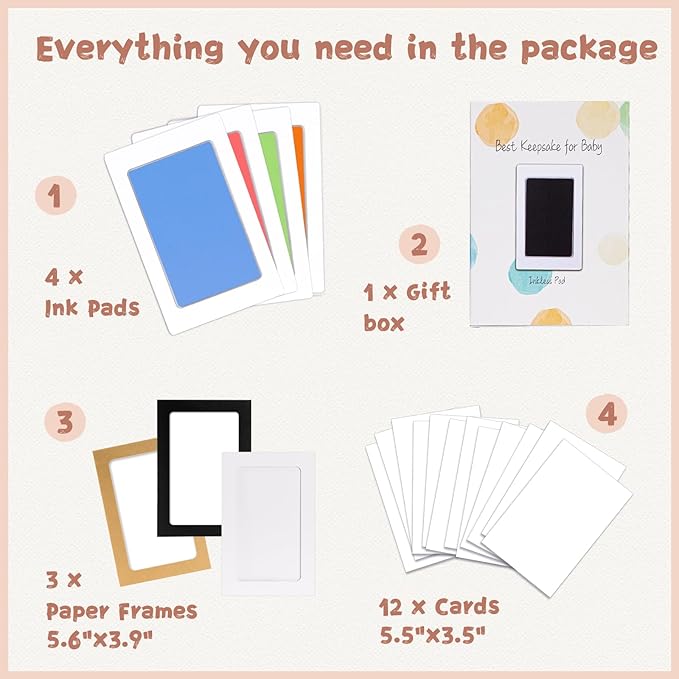 - 【Product Details】: Our baby hand and footprint kit measures 5.0"x3.2" with an ink window of 3.7"x2.3", which is the best size for recording hand and footprints of newborns 0-6 months old or pet paw prints . The ink pad for baby hand and footprints includes 4 clean touch ink pads, 12 stamping cards, and 3 display frames, ensuring you have ample opportunity to capture the best stamp.